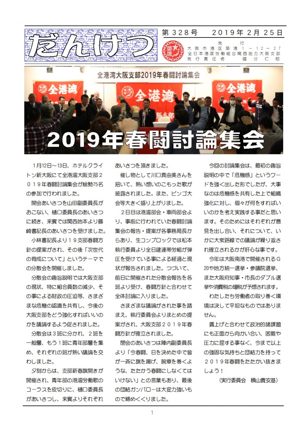 3月3日(日)10:00より大阪支部2019春闘勝利総決起集会が、港区・天保山ホールで開催されました。大阪支部一致団結してガンバロー!