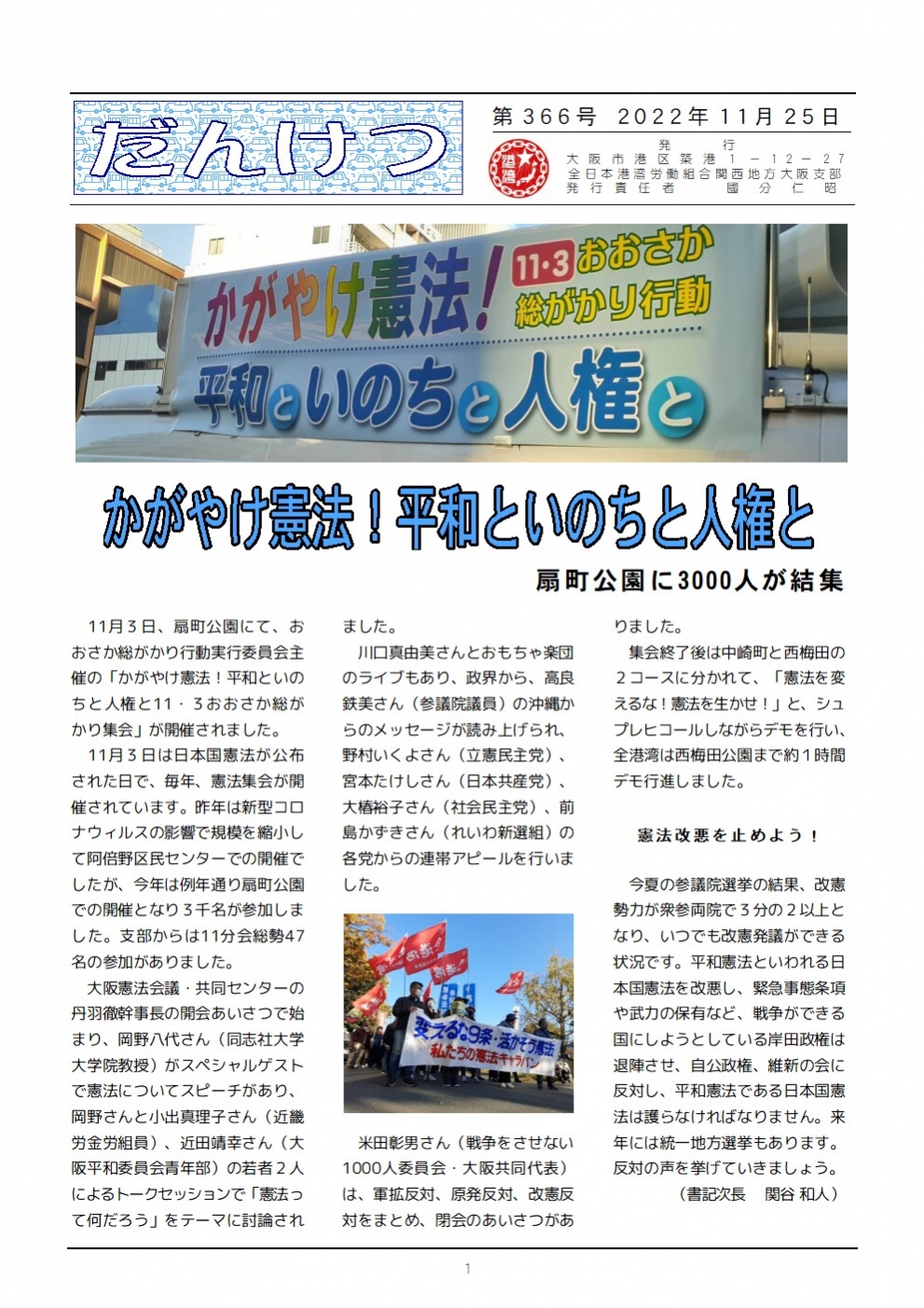 「全日本港湾労働組合関西地方大阪支部第46回定期大会」が開催されました。コロナ禍から代議員のみの参加となりました。